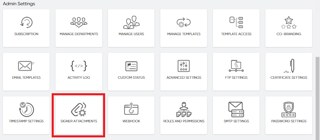 **Step 1:** Login to emSigner Super Admin account. Click on ‘Settings’ tab to open the Admin Settings. Click on ‘***Signer Attachments***’ below Admin Settings