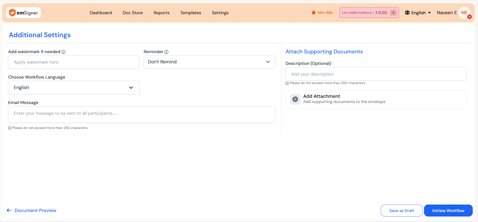 The **Additional Workflow Settings** screen allows the initiator to configure optional, envelope-level preferences before the document is sent for signing. These settings apply to **all participants** in the workflow and help control communication, reminders, document appearance, and reference materials.