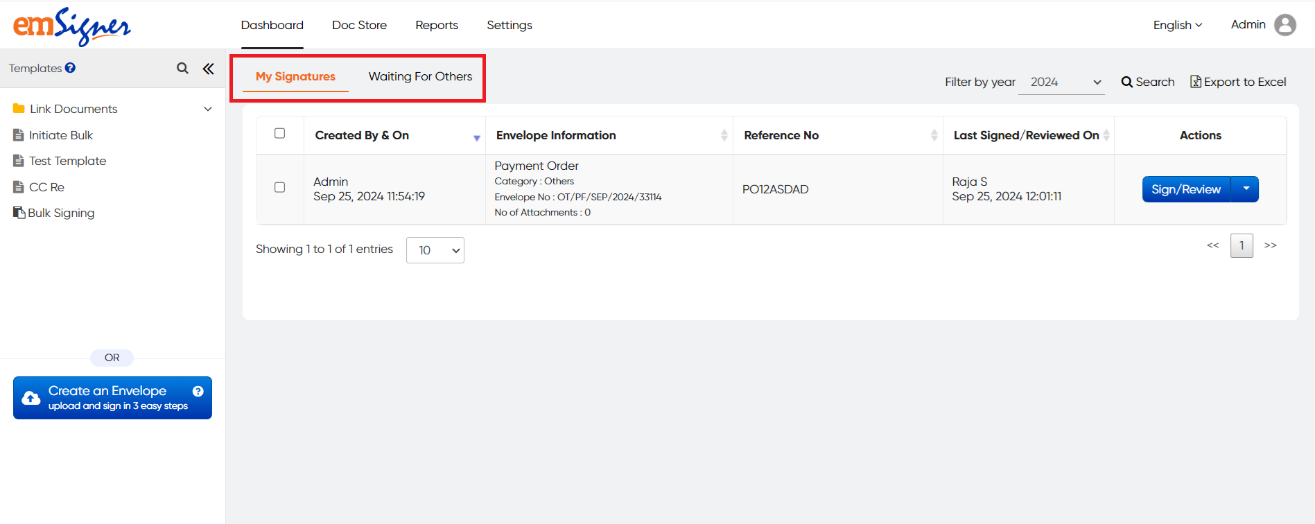 The emSigner dashboard is displayed in a single, consolidated view to help users monitor, analyze, and make informed decisions on the envelopes that are either initiated by them or of which they are a part. It consists of a summarized form of the pending documents present in emSigner shown in tab form, i.e., My Signatures and Waiting for Others.